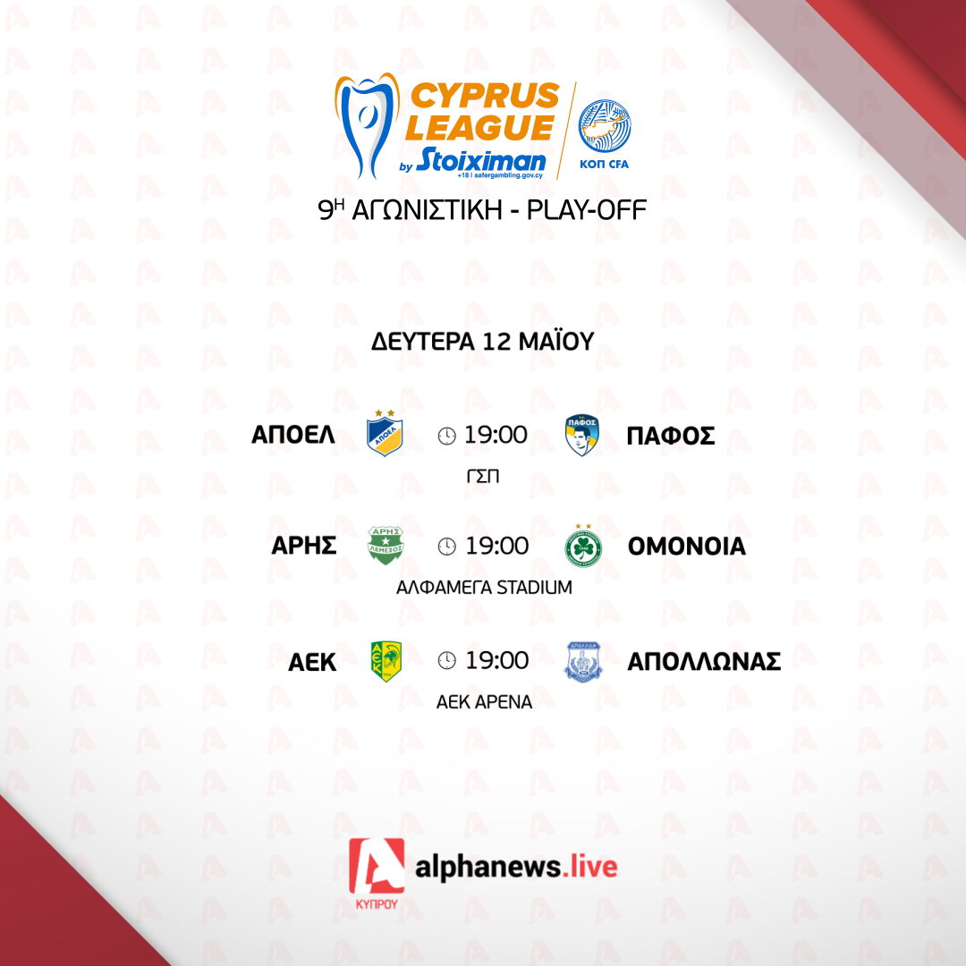 Με τρία παιχνίδια χωρίς μεγάλη βαθμολογική σημασία συνεχίζεται σήμερα (12/05) η δράση στα play-off της Cyprus League by Stoiximan, για την ένατη αγωνιστική. Και τα τρία παιχνίδια θα διεξαχθούν με ώρα έναρξης τις 19:00.