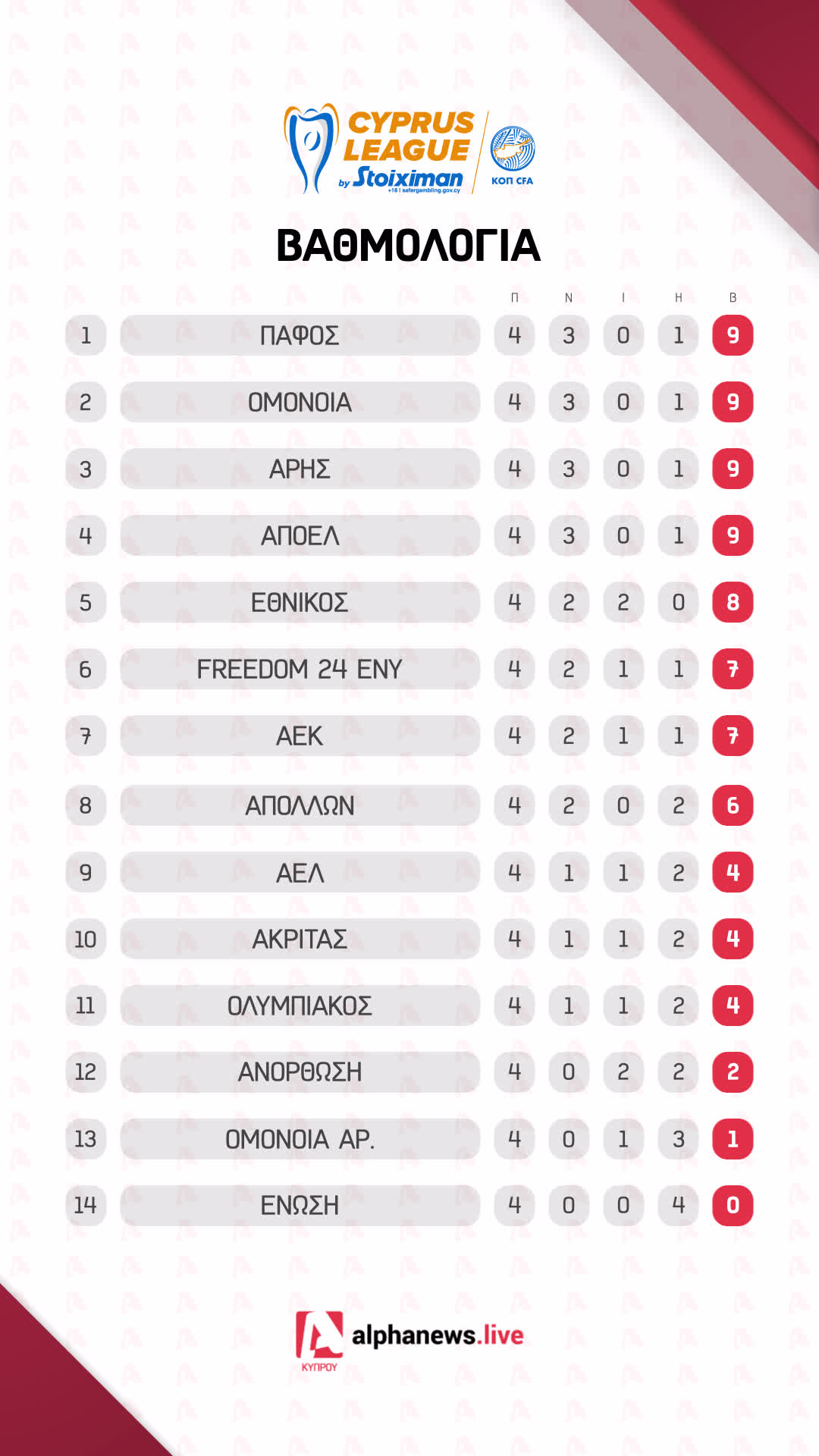 Ούτε μια, ούτε δύο αλλά τέσσερις ομάδες (!) έχουν εννέα βαθμούς, μετά την ολοκλήρωση όλων των εκκρεμοτήτων. Το βράδυ της Τετάρτης, η Πάφος πήρε εύκολη νίκη επί της Ένωσης, στο εξ αναβολής ματς της πρώτης αγωνιστικής και έτσι υπάρχει πλήρης εικόνα της βαθμολογικής… κατάστασης!