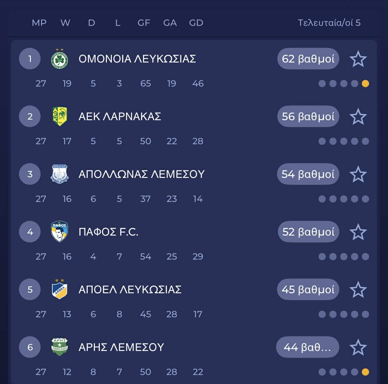 Στο τελευταίο χρονικά παιχνίδι, η ΑΕΚ επικράτησε με 1-0 του ΑΠΟΕΛ και μείωσε τη διαφορά από την κορυφή στους έξι βαθμούς.