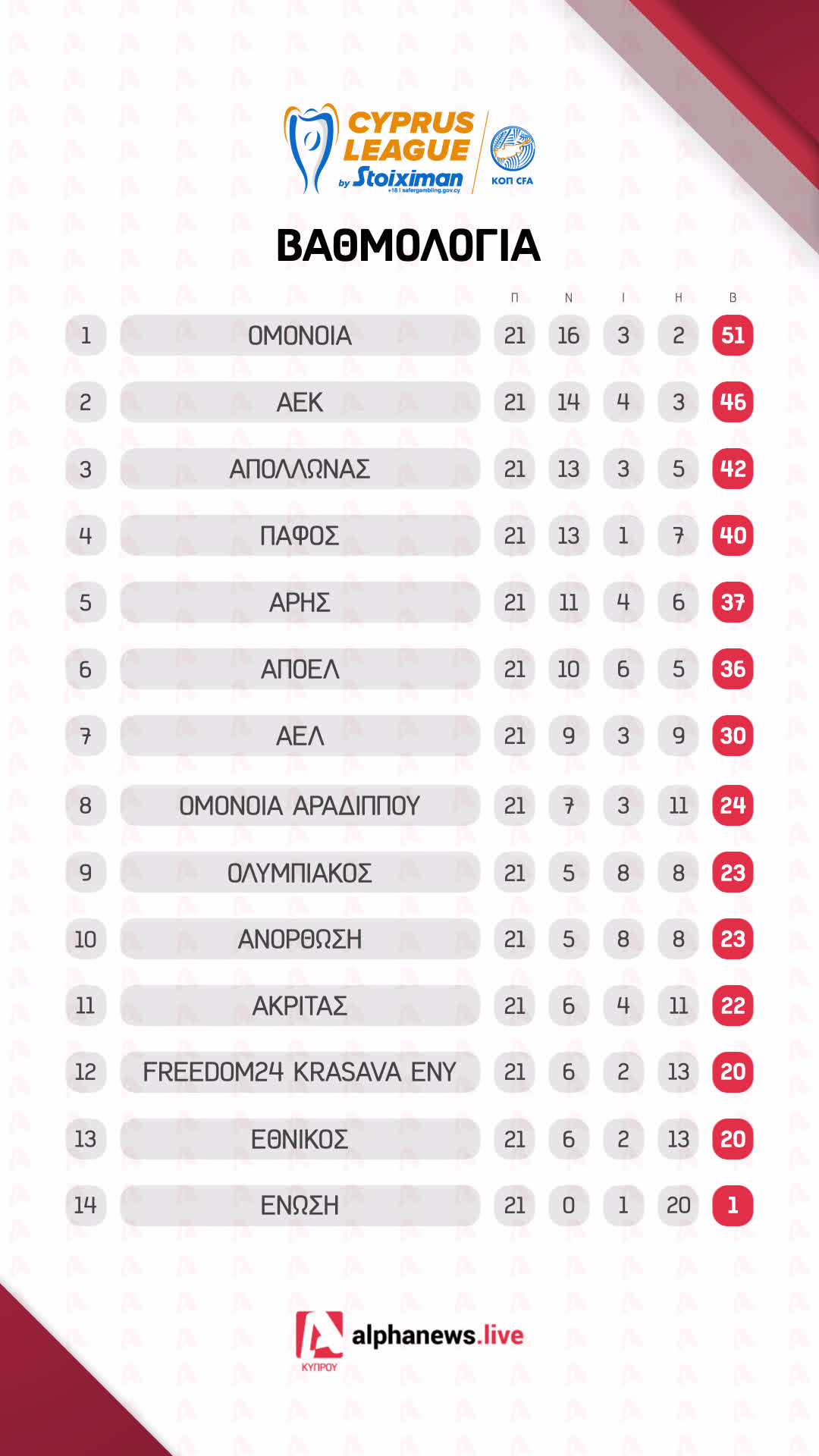 Σταθερά στην πρώτη θέση με «μαξιλαράκι ασφαλείας» παρέμεινε μετά την ολοκλήρωση της 21ης αγωνιστικής της Cyprus League by Stoiximan η Ομόνοια. Οι «πράσινοι» πέρασαν από το «Στέλιος Κυριακίδης» επικρατώντας με 4-2 της Πάφου, αφήνοντας τους περσινούς πρωταθλητές στο -11 από την κορυφή.
