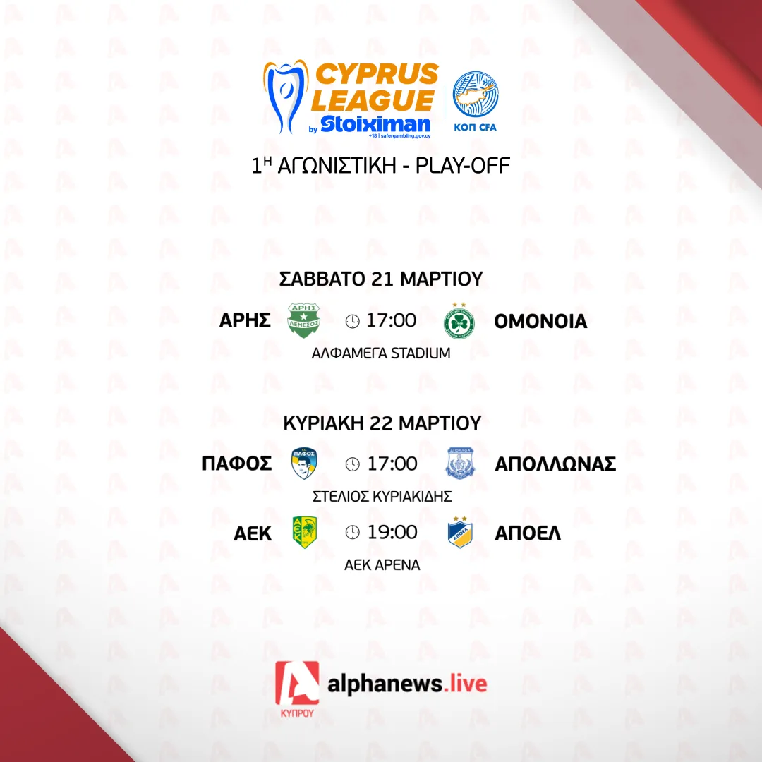 Με τρεις αναμετρήσεις συνεχίζεται σήμερα Σάββατο (21/03) η δράση στη δεύτερη φάση της Cyprus League by Stoiximan, με τη διεξαγωγή της πρεμιέρας σε play-off και play-out.