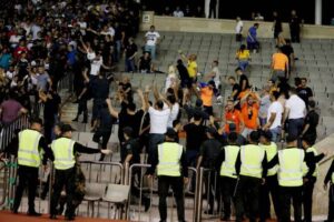 Οι Αζέροι έφτασαν πολύ κοντά στο λεωφορείο και έσπασαν κάποια τζάμια με πέτρες και διάφορα αντικείμενα όμως ευτυχώς δεν υπήρξε κάποιος τραυματισμός από πλευράς των οπαδών του ΑΠΟΕΛ.