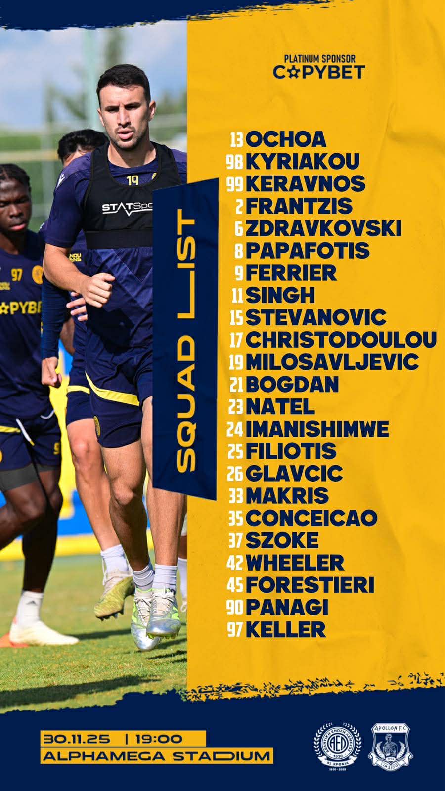Εκτός επιλογών για τους «γαλαζοκίτρινους» είναι οι Ζράντι, Τομάλα, Ουεντραόγκο και Νεοφύτου.