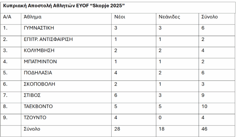 Η αποστολή της Κυπριακής Ολυμπιακής Επιτροπής αναχωρεί αύριο (19/07) για τη Βόρεια Μακεδονία ενόψει του 17ου Ευρωπαϊκού Ολυμπιακού Φεστιβάλ Νέων (EYOF). Η φετινή διοργάνωση θα διεξαχθεί στα Σκοπιά από τις 20 μέχρι τις 26 Ιουλίου 2025. Στη διοργάνωση θα συμμετέχουν 4000 αθλητές από 48 χώρες.