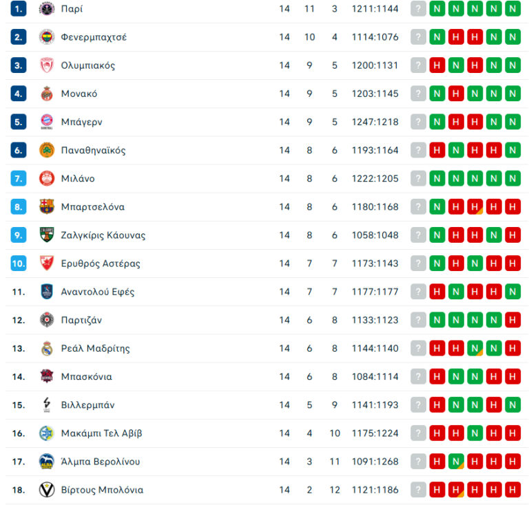Όσον αφορά τον Παναθηναϊκό AKTOR, η ολοκλήρωση της αγωνιστικής τον βρήκε στην 6η θέση με ρεκόρ 8-6 μετά και την βαριά ήττα της Πέμπτης από την Παρτίζαν.