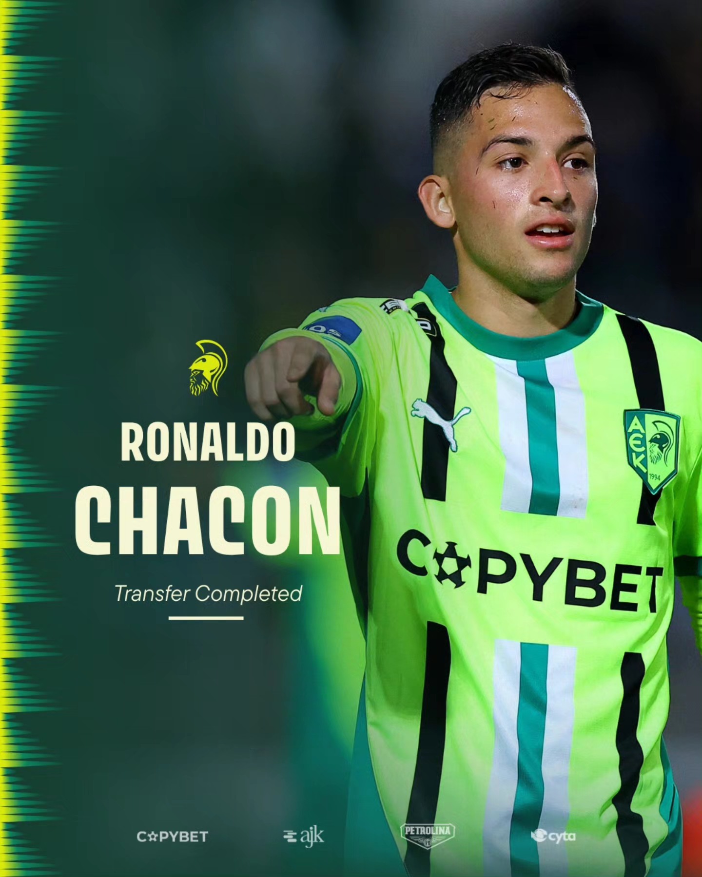 Η ανακοίνωση της ομάδας: «Η Aθλητική Ένωση Κίτιον (ΑΕΚ) Λάρνακας ανακοινώνει ότι έχει εξασκήσει το δικαίωμα αγοράς του Yerson Ronaldo Chacon από την Deportivo Tachira και ο ποδοσφαιριστής έχει υπογράψει συμβόλαιο συνεργασίας για τα επόμενα 2+1 χρόνια.