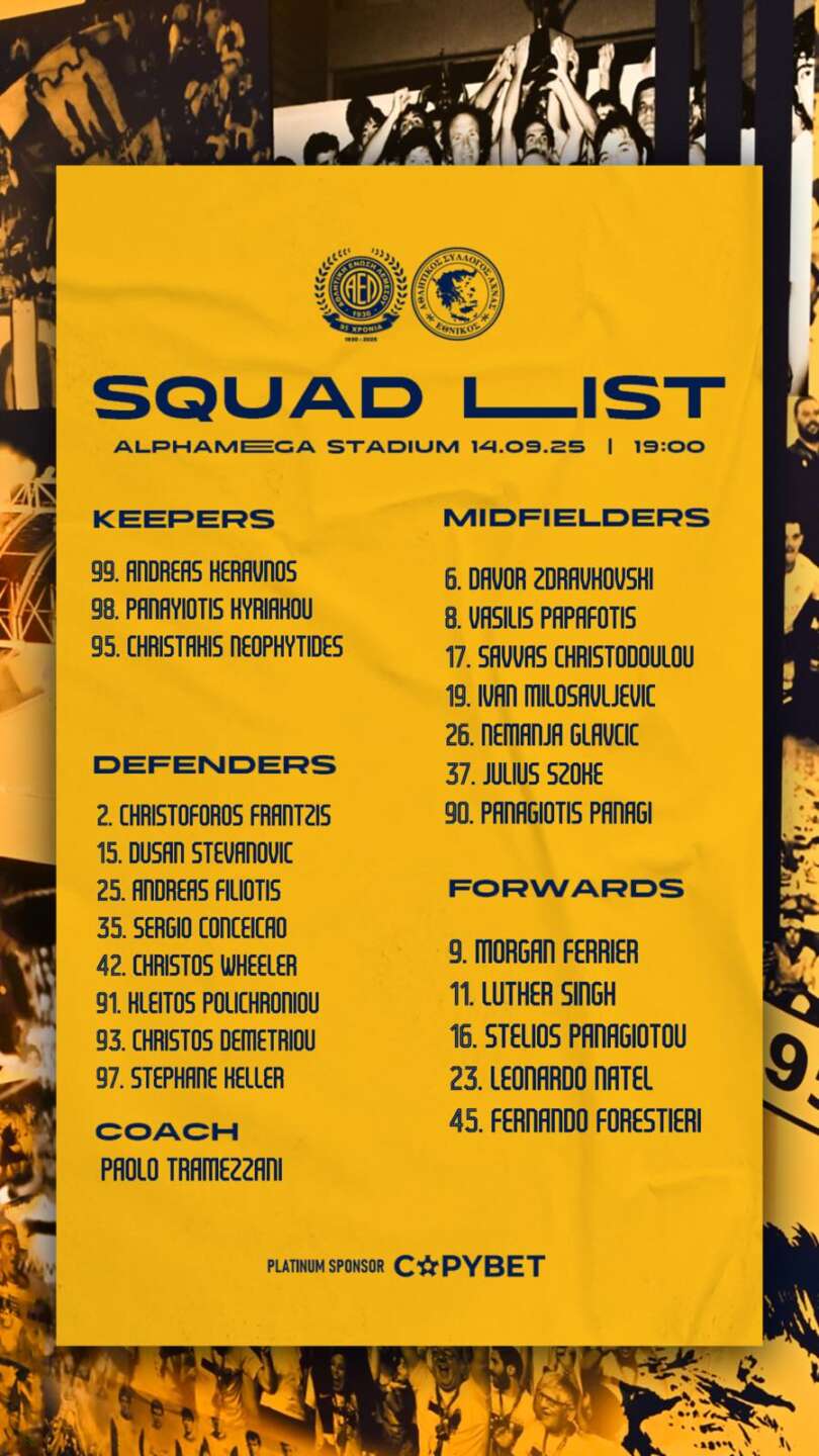 Εκτός αποστολής έμειναν οι: Ντίλαν Ουεντραόγκο, Ντένις Τομάλα, Αντρέας Μακρής, Λούκα Μπόγκταν, Μπασέλ Ζράντι (δέχτηκε χτύπημα στην σημερινή προπόνηση), Μέμο Οτσόα και Εμμάνουελ Ιμανισίμγουε.