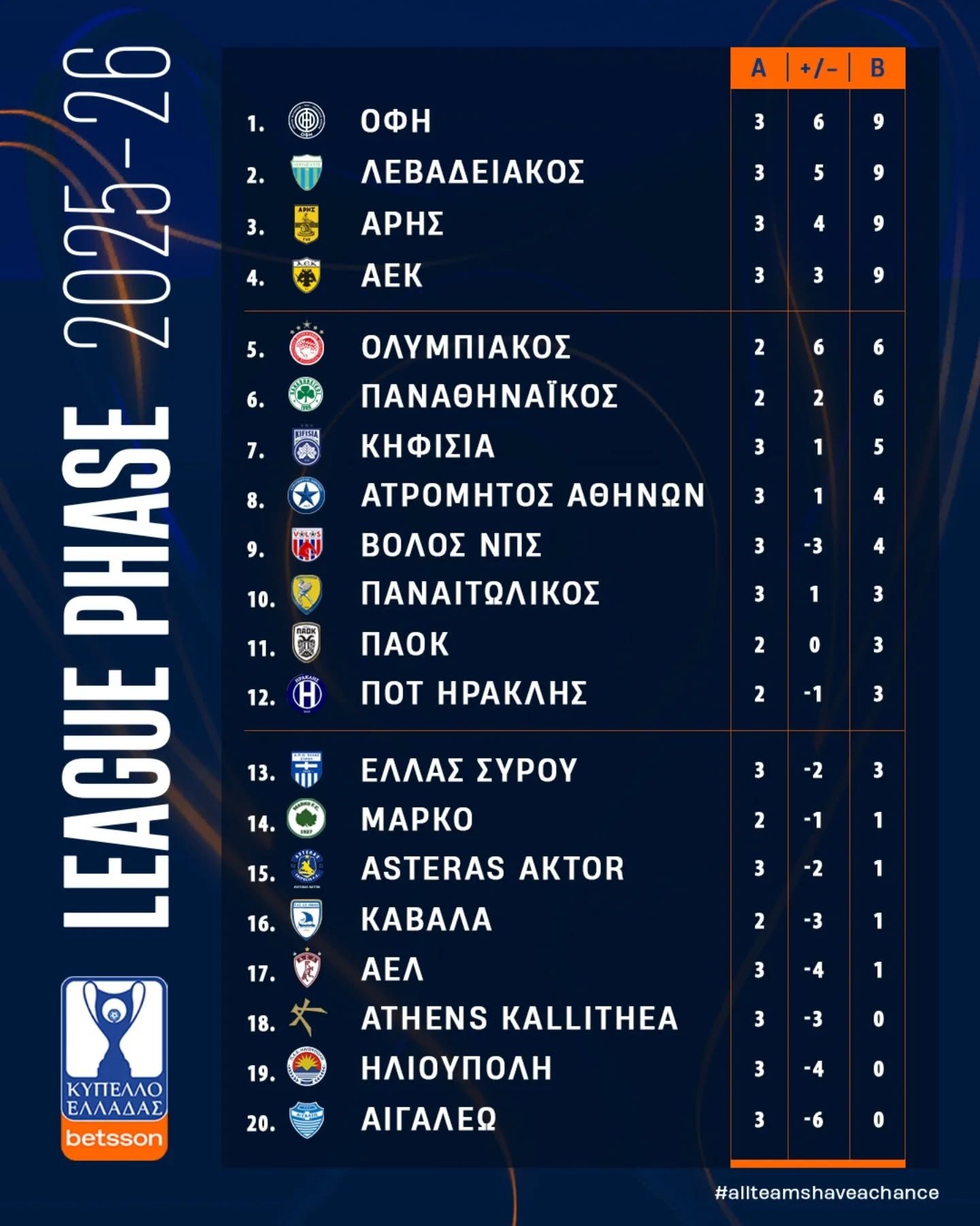Ολοκληρώθηκε η 3η αγωνιστική του Κυπέλλου Ελλάδας και τέσσερις ομάδες ισοβαθμούν στην πρώτη τετράδα της League Phase, που εξασφαλίζει απευθείας πρόκριση στους «8» της διοργάνωσης.