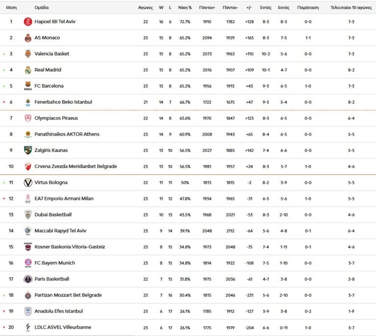 Η βαθμολογία της Εuroleague μετά τις νίκες Παναθηναϊκού και Ολυμπιακού