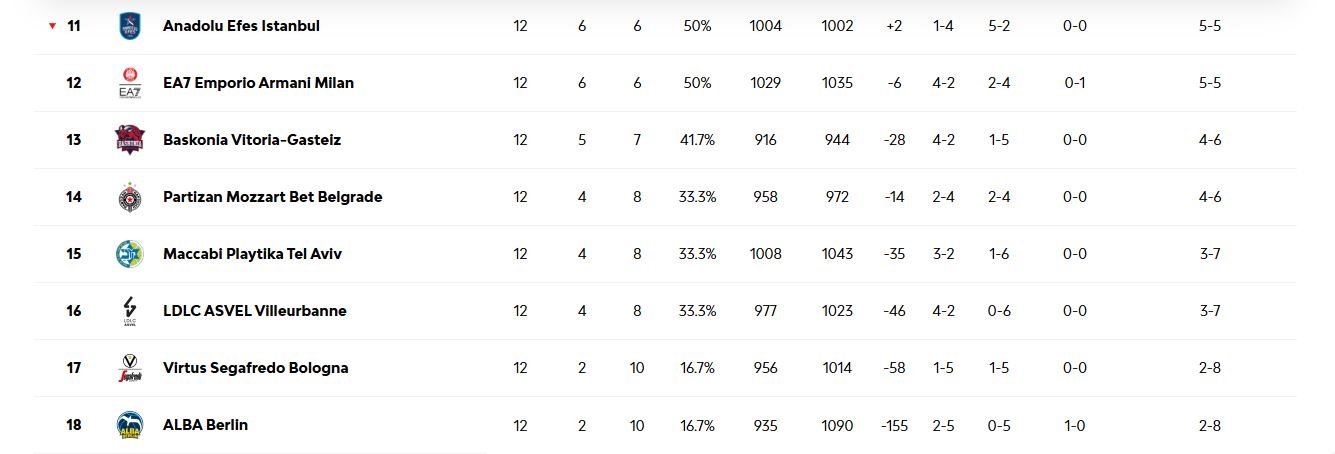 Αναλυτικά η βαθμολογία της Ευρωλίγκας