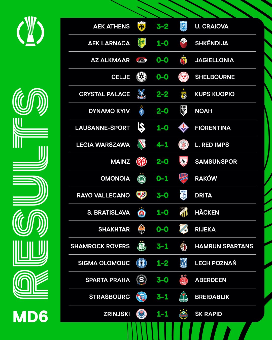 Εύκολη νίκη και… 4η θέση για την Σπάρτα Πράγας, η οποία νίκησε 3-0 την Αμπερντίν, ενώ η Ράγιο Βαγιεκάνο, που βρίσκεται από κάτω της (5η), πραγματοποίησε έναν περίπατο απέναντι στην Ντρίτα με το εμφατικό 3-0.