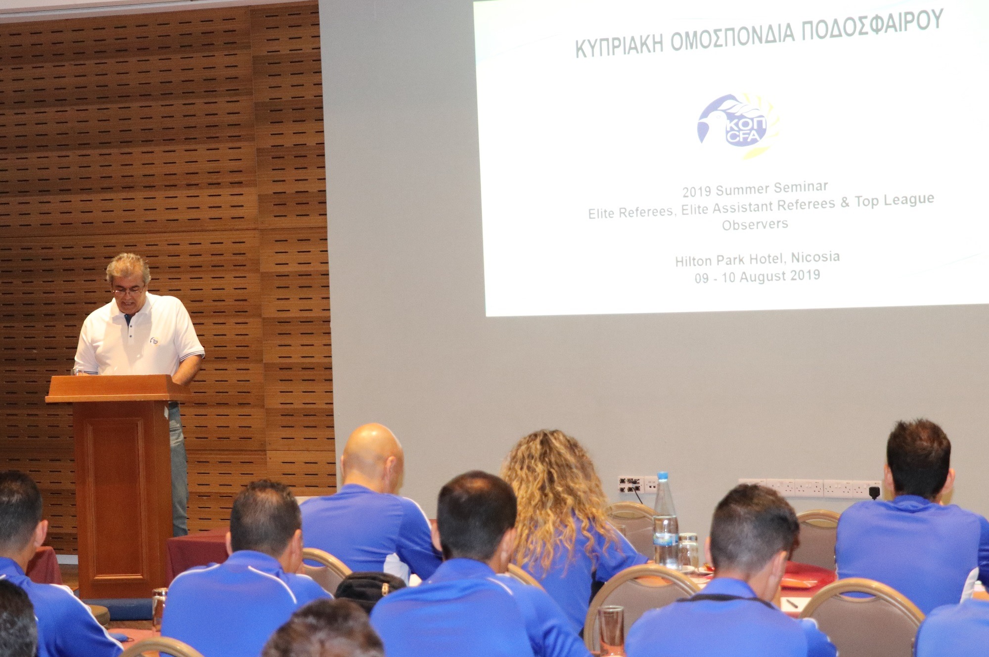 Άρχισαν το πρωί της Παρασκευής (9/08) και ολοκληρώνονται το Σάββατο (10/08) οι εργασίες του ετήσιου Σεμιναρίου Διαιτησίας. Το Σεμινάριο απευθύνεται στους διαιτητές και βοηθούς διαιτητές κατηγορίας Elite και Premier και είναι το πρώτο υπό το νέο Πρόεδρο της Επιτροπής Διαιτησίας Μπερτράντ Λαγιέκ.Πριν την έναρξη των εργασιών του Σεμιναρίου, ο Γενικός Διευθυντής της ΚΟΠ Ανθούλης Μυλωνάς μετέφερε στους συμμετέχοντες το χαιρετισμό του Προέδρου Γιώργου Κούμα, τονίζοντας τη σημασία που δίνει η ΚΟΠ στην εκπαίδευση των διαιτητών αλλά και την εμπιστοσύνη με την οποία περιβάλλει η Ομοσπονδία την Κυπριακή διαιτησία.”Σας εμπιστευόμαστε, η ΚΟΠ είναι το σπίτι σας και είστε αναπόσπαστο κομμάτι αυτής της οικογένειας. Βρισκόμαστε όλοι στο ίδιο χαράκωμα με βασικό στόχο την ανάπτυξη και πρόοδο του κυπριακού ποδοσφαίρου” ήταν το ξεκάθαρο μήνυμα του Προέδρου της ΚΟΠ προς τους διαιτητές.Αναλυτικά ο χαιρετισμός του Προέδρου της ΚΟΠ στο Σεμινάριο διαιτησίας.«Αγαπητοί Φίλοι και Συνεργάτες,Σας καλωσορίζω στο καθιερωμένο σεμινάριο διαιτησίας που πραγματοποιείται κάθε χρόνο πριν την έναρξη του Πρωταθλήματος. Φέτος υπάρχει μια ιδιαιτερότητα καθώς πρόκειται για το πρώτο σεμινάριο που θα πραγματοποιηθεί με το νέο Πρόεδρο της Επιτροπής Διαιτησίας, κ. Λαγιέκ, τον οποίο καλωσορίζω για ακόμη μια φορά στην Κύπρο και στην ΚΟΠ.Ως Κυπριακή Ομοσπονδία Ποδοσφαίρου έχουμε επενδύσει ιδιαίτερα τα τελευταία χρόνια στο τομέα της επιμόρφωσης των διαιτητών. Πιστεύω πως η εκπαίδευση είναι ένα βασικό συστατικό που δίνει στο κάθε διαιτητή, την γνώση και την αυτοπεποίθηση για να μπορέσει να ανταπεξέλθει στην αποστολή του.Έχουμε επενδύσει πολλά στη διαιτησία και θα συνεχίσουμε να το πράττουμε κάνοντας το μεγάλο βήμα της εισαγωγής του VAR στο Κυπριακό Πρωτάθλημα. Το VAR δεν αντικαθιστά τον διαιτητή, παρά μόνο είναι ένα επιπλέον εργαλείο που θα τον στηρίξει και θα τον βοηθήσει να κάνει καλύτερα τη δουλεία του με περισσότερη αξιοπιστία αλλά και αντιμετωπίζοντας τη γνωστή προκατάληψη σε βάρος των διαιτητών.Αγαπητοί φίλοι και φίλες,Σας εμπιστευόμαστε, η ΚΟΠ είναι το σπίτι σας και είστε αναπόσπαστο κομμάτι αυτής της οικογένειας. Βρισκόμαστε όλοι στο ίδιο χαράκωμα με βασικό στόχο την ανάπτυξη και πρόοδο του κυπριακού ποδοσφαίρου.Όπως και σε κάθε οικογένεια έτσι και στη δική μας, είμαστε έτοιμοι να συγχωρέσουμε λάθη και να δείξουμε κατανόηση, θα είμαστε όμως αυστηροί εκεί και όπου κρίνουμε ότι υπάρχει πρόθεση ή ότι το λάθος είναι επαναλαμβανόμενο. Το ξέρω πως και εσείς αυτό ζητάτε γιατί μόνο έτσι θα γίνουμε όλοι καλύτεροι.Συνεχίζουμε από εκεί που μείναμε στη προηγούμενη χρονιά στην οποία η διαιτησία κινήθηκε σε πολύ καλά επίπεδα. Ως ηγεσία της ΚΟΠ είμαστε ικανοποιημένοι για την παρουσία σας, για αυτό ξέρουμε ότι με τη δική σας προσφορά και θέληση θα μπορέσουμε να πάμε ακόμη καλύτερα αλλά και να βάλουμε τις βάσεις για το μέλλον της διαιτησίας μας. Πρόθεση του Προέδρου της Επιτροπής Διαιτησίας είναι να δώσει έμφαση στο παρόν αλλά και να κτίσει τη διαιτησία για το μέλλον. Σε αυτό τον δρόμο θα είμαστε συνοδοιπόροι.