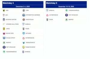 Ο Ολυμπιακός δεν θα δώσει αγώνα στην πρώτη αγωνιστική και αντίστοιχα Παναθηναϊκός και ΠΑΟΚ δεν θα αγωνιστούν στη δεύτερη αγωνιστική λόγω των ευρωπαϊκών τους υποχρεώσεων. Οι αναμετρήσεις τους μεταφέρθηκαν για την πέμπτη και τελευταία αγωνιστική της League Phase.