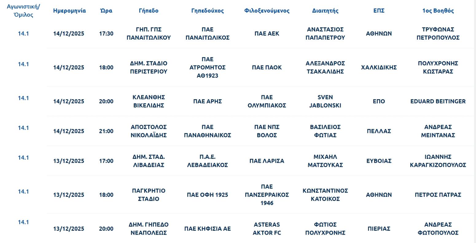 Η ΚΕΔ έκανε γνωστά τα ονόματα των διαιτητών για τις αναμετρήσεις της 14ης ημέρας του πρωταθλήματος της Stoiximan Super League με τον Σβεν Γιαμπλόνσκι να ορίζεται να διευθύνει το ματς στο «Κλεάνθης Βικελίδης» ανάμεσα στον Άρη και στον Ολυμπιακό.