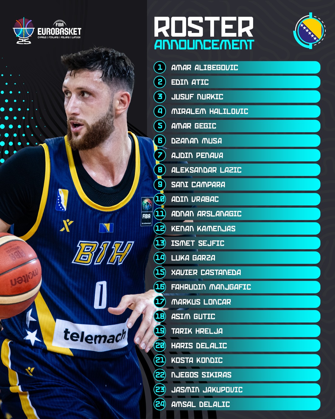 Με όλα της τα αστέρια, θα αγωνιστεί στο FIBA EuroBasket 2025 η Εθνική ομάδα της Βοσνίας και Ερζεγοβίνης! Ο ομοσπονδιακός προπονητής Adis Beciragic κάλεσε 24 καλαθοσφαιριστές για την έναρξη της προετοιμασίας, ενόψει της συμμετοχής της χώρας στον Γ’ Όμιλο που θα διεξαχθεί στην Κύπρο και στο Αθλητικό κέντρο Σπύρος Κυπριανού.