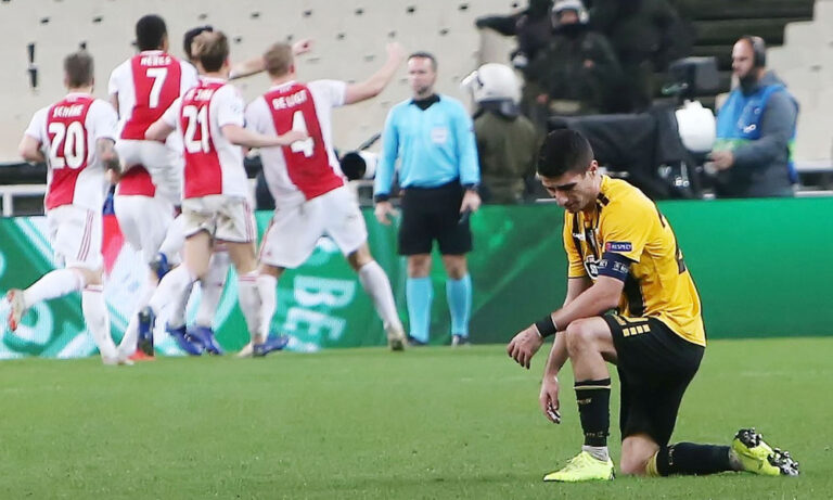 Η ευρωπαϊκή πορεία της ΑΕΚ τερμάτισε το βράδυ της Τρίτης στο ΟΑΚΑ. Η ήττα 2-0 από τον Άγιαξ απέκλεισε οριστικά την Ένωση από οποιαδήποτε συνέχεια, την ώρα που οι Ολλανδοί για πρώτη φορά μετά από 13 χρόνια περνούν στους «16» του Champions League. Το βαρύ κλίμα συνεχίζεται για την Ένωση που δείχνει… βαριά άρρωστη και δεδομένα θα χρειαστεί ριζικές αλλαγές και παρεμβάσεις για να ξεφύγει από αυτή την κατάσταση στην οποία έχει μπει. Το σίγουρο είναι πως η ΑΕΚ κινδυνεύει να γράψει… μαύρες σελίδες ιστορίας αν στην τελευταία αγωνιστική των ομίλων του Champions League ηττηθεί κι από τη Μπενφίκα στο «Ντα Λουζ», αφού θα γίνει η πρώτη ελληνική ομάδα που θα τελειώσει τον όμιλο χωρίς να πάρει ούτε έναν βαθμό…