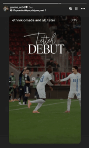 Ξημερώματα Πέμπτης, μία ημέρα μετά τη διάκριση, ο Γιάννης Αντετοκούνμπο ανέβασε μια σειρά από stories στο Instagram. Ο «Greek Freak» μοιράστηκε στιγμιότυπα από το ντεμπούτο του Τεττέη με το εθνόσημο, την αναφορά του στη μητέρα του και τους πανηγυρισμούς μετά την ασίστ στο γκολ του Καρέτσα.