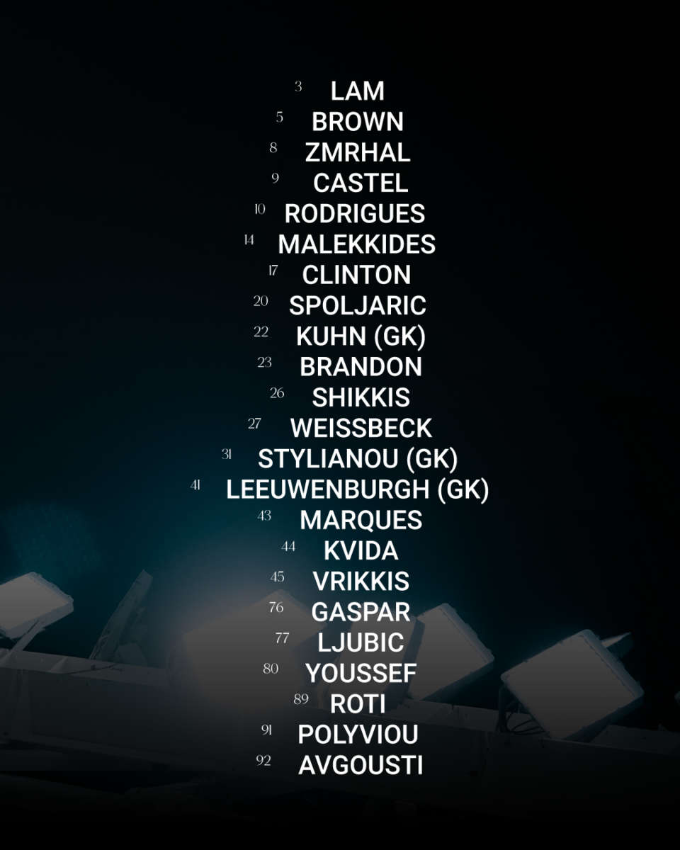 Ο Σωφρόνης Αυγουστή δεν υπολογίζει στους Λάζαρ Μάρκοβιτς, Μαρσελίνο, Ζαχαρίας Άδωνη οι οποίοι είναι παροπλισμένοι, όπως επίσης και στον τιμωρημένο Πραξιτέλης Βούρος. Αντίθετα, πρόλαβε το… λεωφορείο ο Μάρκες ο οποίος ήταν αμφίβολος.