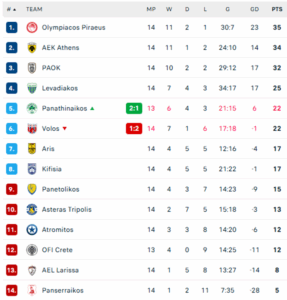 Τέλος, μετά τη νίκη του επί του Βόλου, ο Παναθηναϊκός έπιασε τους Θεσσαλούς στους 22 βαθμούς και την πέμπτη θέση, έχοντας και ένα παιχνίδι λιγότερο.