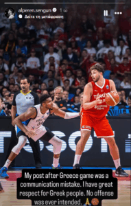 Ο Τούρκος NBAer ανέβασε σε στόρι στο Instagram μια φωτογραφία του με τον Greek Freak, γράφοντας πως «η δημοσίευσή μου μετά το ματς με την Ελλάδα ήταν ένα επικοινωνιακό λάθος. Τρέφω μεγάλο σεβασμό για τους Έλληνες, δεν είχα σκοπό να προσβάλω».