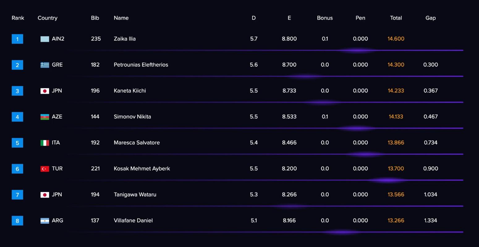 Την πρώτη θέση και το χρυσό μετάλλιο κατέκτησε ο Ίλια Ζάικα ο οποίος συγκέντρωσε στον σημερινό τελικό 8800 με βαθμό δυσκολίας 5,7 φτάνοντας στους 14.600 βαθμούς στο σύνολο.