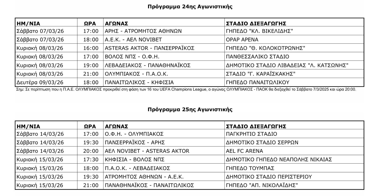 Γνωστό έγινε από την Stoiximan Super League το πρόγραμμα των αγωνιστικών που απομένουν μέχρι και το τέλος της κανονικής διάρκειας του πρωταθλήματος, δηλαδή, από την 16η μέχρι και την 26η αγωνιστική.