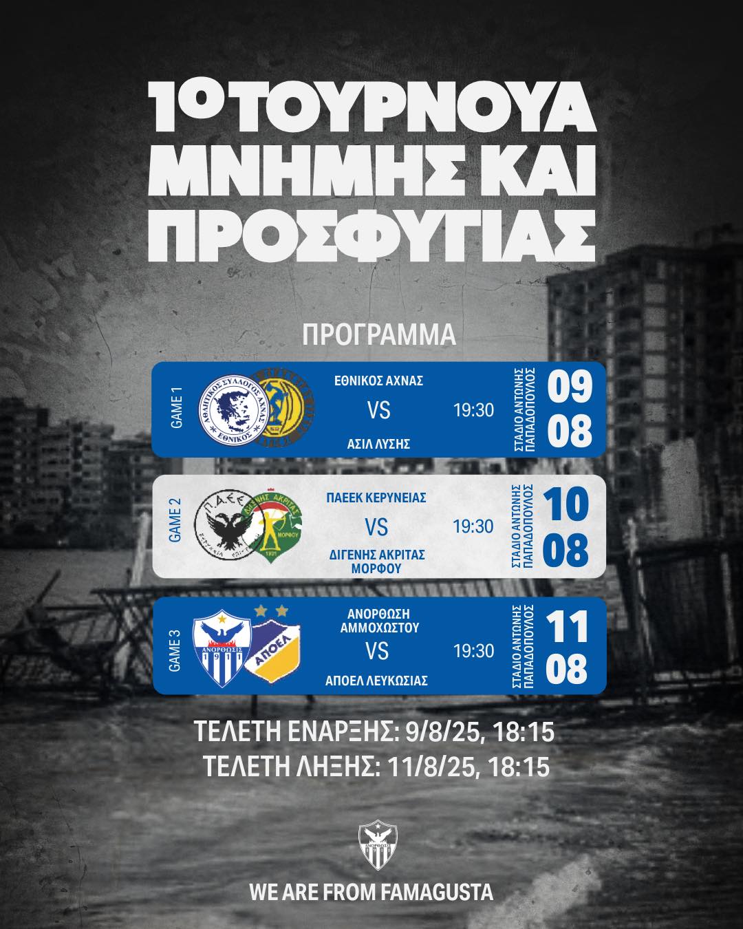 Η Ανόρθωση Αμμοχώστου, η «μάνα» των προσφυγικών σωματείων, διοργανώνει το Πρώτο Τουρνουά Προσφυγιάς, από τις 9 έως τις 11 Αυγούστου, στο προσωρινό της σπίτι, το Στάδιο «Αντώνης Παπαδόπουλος» στη Λάρνακα.