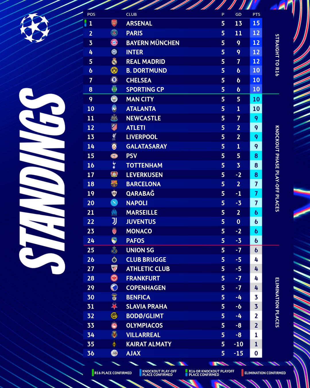 Στην κορυφή της βαθμολογίας η Άρσεναλ έμεινε μόνη πρώτη αφού επικράτησε της Μπάγερν με 3-1, με την Παρί Σεν Ζερμέν να την ακολουθεί στην δεύτερη θέση. Στην πεντάδα ανέβηκε η Ρεάλ Μαδρίτης, ενώ Μπαρσελόνα είναι εκτός 16άδας. Μεγάλη έκπληξη έκανε η Αϊντχόφεν που πέρασε με τεσσάρα από την έδρα της Λίβερπουλ, η οποία έμεινε εκτός της πρώτης 8άδας.