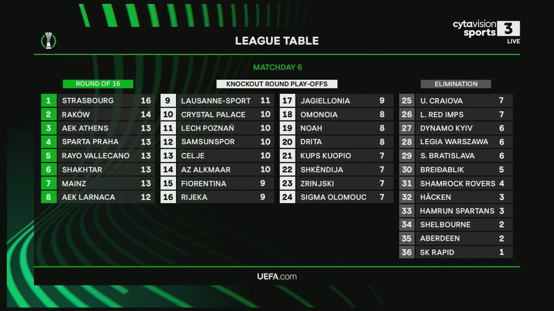 Ολοκληρώθηκε η League Phase του Conference League και έχουμε πλέον ξεκάθαρα δεδομένα για τις ομάδες που τερμάτισαν στην πρώτη οκτάδα και πήραν απευθείας το εισιτήριο για τη φάση των «16», αλλά και αυτές που κατέλαβαν τις θέσεις 9-24 και θα αγωνιστούν στην ενδιάμεση φάση.