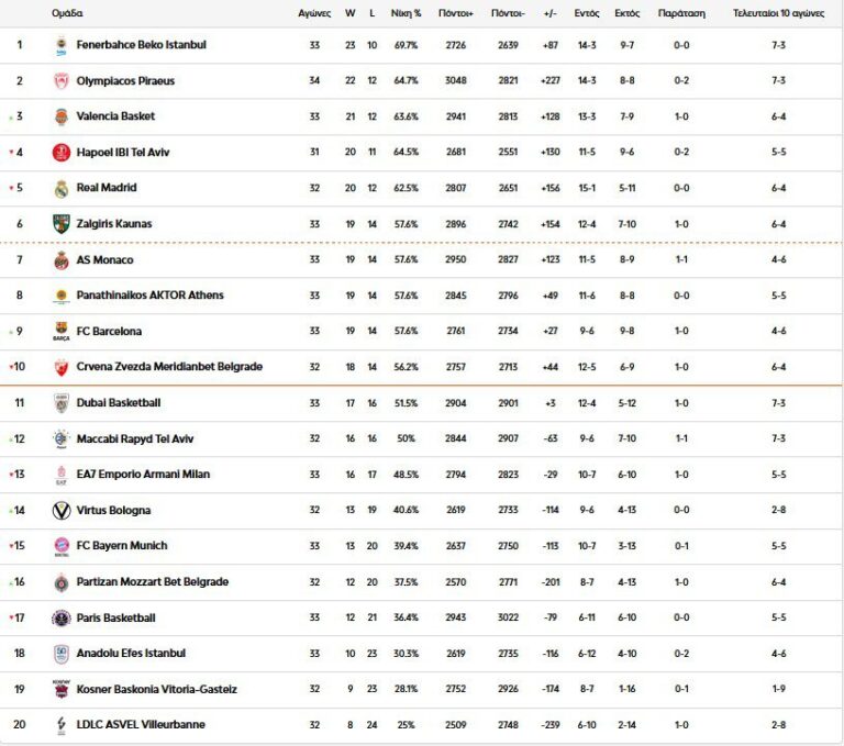 Από την άλλη πλευρά, ο Ολυμπιακός είδε τη μάχη για την τετράδα και το πλεονέκτημα έδρας να… αναζωπυρώνεται, καθώς ηττήθηκε με σκορ 85-84 από τη Βαλένθια και έπεσε στο 22-12, παραμένοντας πολύ κοντά στις «νυχτερίδες» αλλά και στις Ρεάλ Μαδρίτης, Χάποελ Τελ Αβίβ.