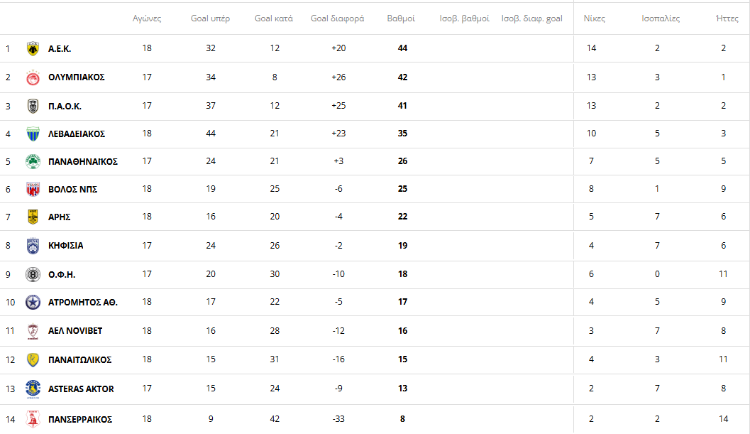 Βαθμολογία Super League: Έχασε και άλλο έδαφος ο Παναθηναϊκός – Στην κορυφή η ΑΕΚ