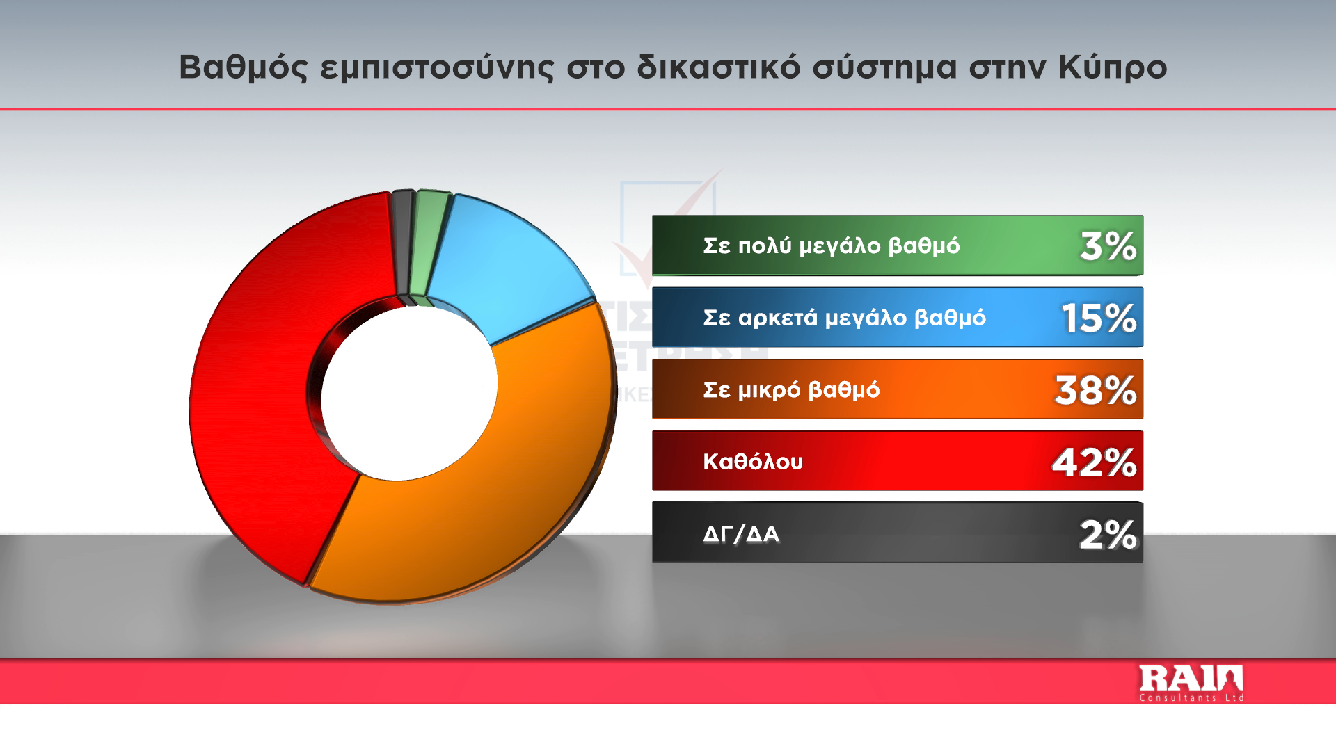 Ποσοστό 80% έχει αρνητική εικόνα για το δικαστικό σύστημα της Κύπρου, με το 42% να μην το εμπιστεύεται καθόλου και το 38% να εκφράζει μικρό βαθμό εμπιστοσύνης. Μόλις το 18% εκφράζει θετική άποψη για το δικαστικό σύστημα, με το 15% να δηλώνει ότι το εμπιστεύεται σε αρκετά μεγάλο βαθμό και το 3% σε πολύ μεγάλο βαθμό.
