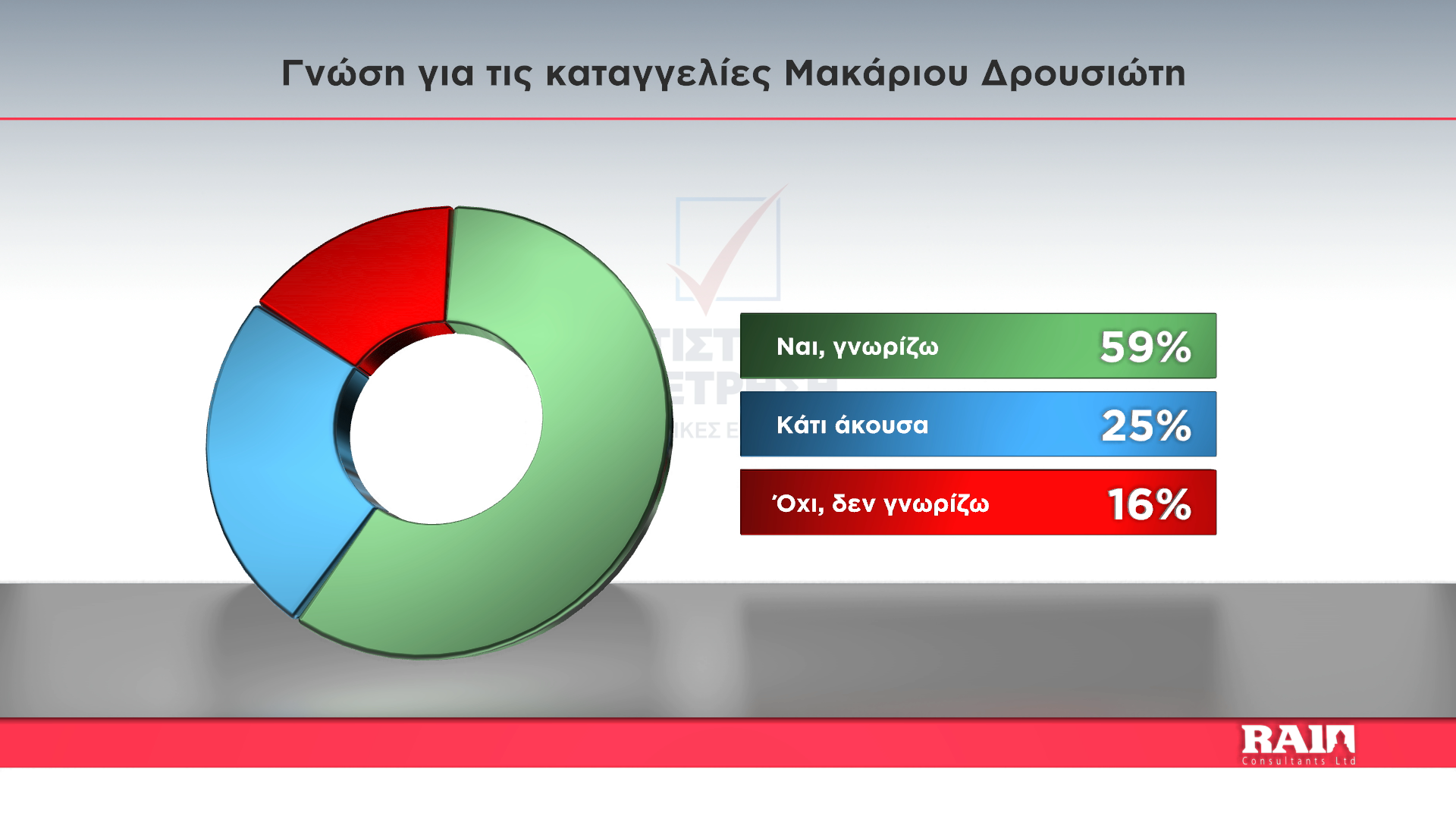 Στην ερώτηση αν γνωρίζουν για το περιεχόμενο των καταγγελιών του Μακάριου Δρουσιώτη, το 59% απαντά ότι γνωρίζει, το 25% ότι κάτι άκουσε και το 16% απαντά αρνητικά.