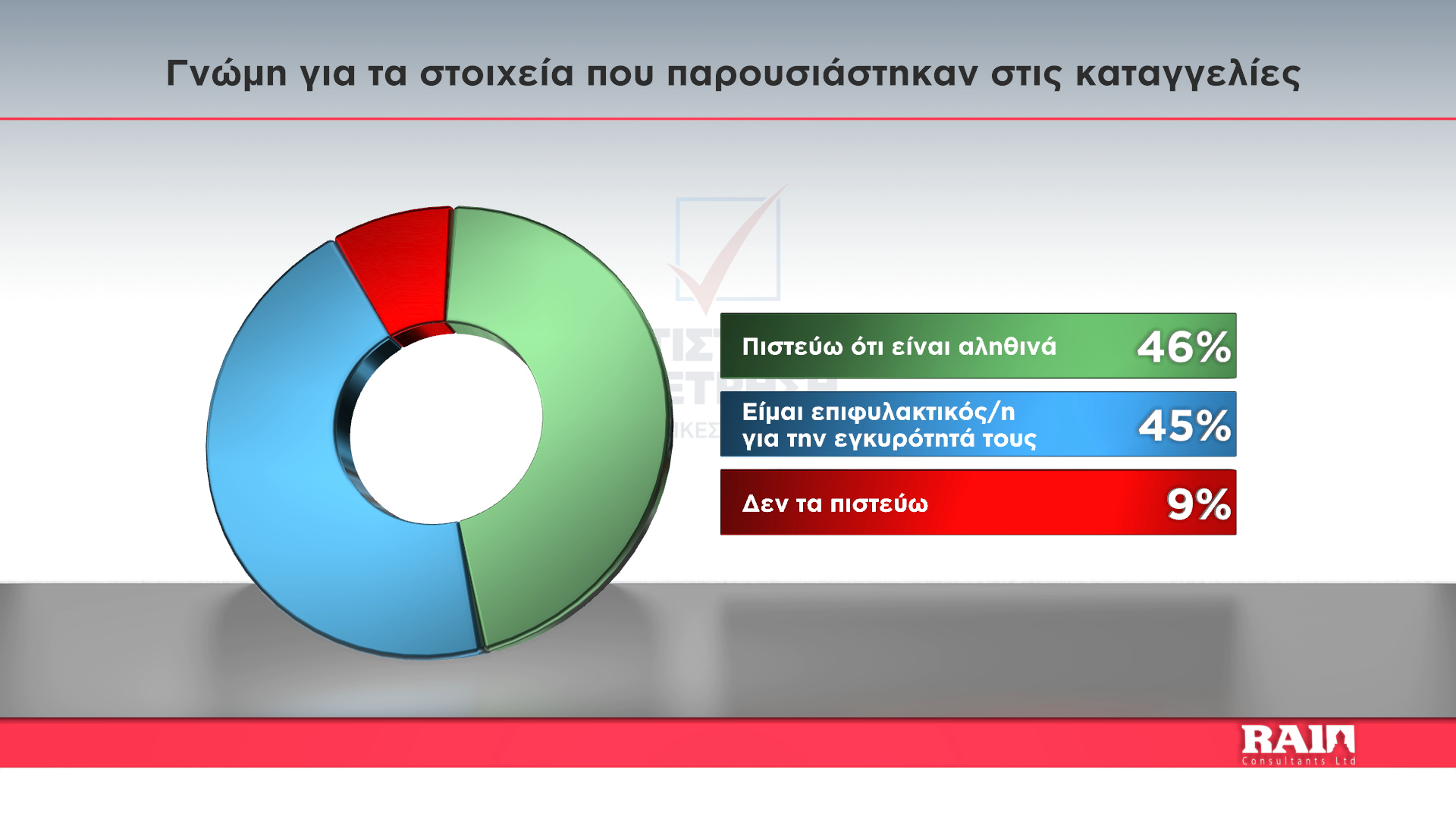 Ιδιαίτερο ενδιαφέρον παρουσιάζει και η γνώμη των πολιτών για τα στοιχεία που παρουσιάζονται στις καταγγελίες, με το 46% να πιστεύει ότι είναι αληθινά, το 45% να εκφράζει επιφύλαξη για την εγκυρότητά τους και το 9% να δηλώνει ότι δεν τα πιστεύει.
