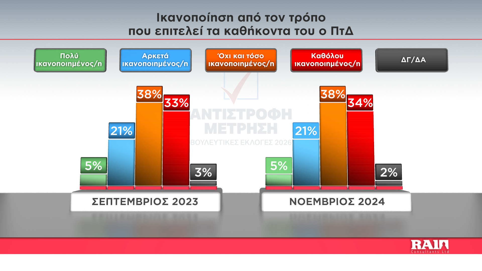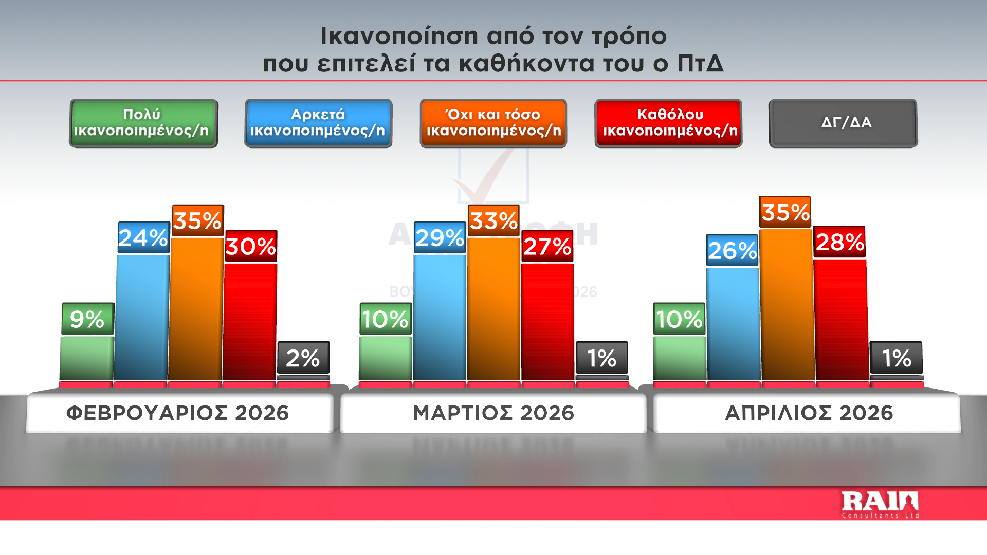 Η τέταρτη κατά σειρά δημοσκόπηση που διενήργησε για λογαριασμό του Alpha Κύπρου η Rai Consultants ενόψει των Βουλευτικών Εκλογών του 2026 και παρουσιάστηκε στην εκπομπή «Αντίστροφη Μέτρηση» καταδεικνύει πως το 36% των ερωτηθέντων δηλώνει πολύ και αρκετά ικανοποιημένο από τον τρόπο που επιτελεί τα καθήκοντα του ο Νίκος Χριστοδουλίδης. Όχι και τόσο ικανοποιημένο απάντησε το 35%, ενώ το 28% καθόλου ικανοποιημένο.