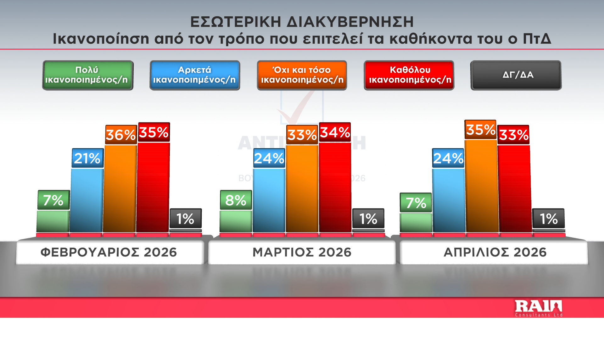 Στην εσωτερική διακυβέρνηση, οι συμμετέχοντες στην έρευνα Απριλίου απάντησαν ότι είναι πολύ ικανοποιημένοι και αρκετά ικανοποιημένοι σε ποσοστό 31%. Όχι και τόσο ικανοποιημένοι και καθόλου ικανοποιημένοι δηλώνουν το 35% και 33%, αντίστοιχα.