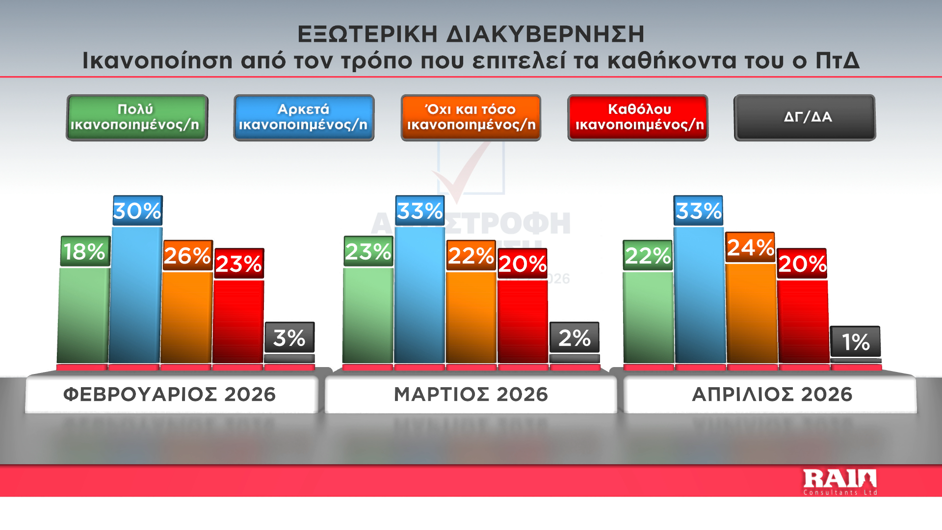 Στην εξωτερική διακυβέρνηση, ο Πρόεδρος της Δημοκρατίας απολαμβάνει μεγαλύτερα ποσοστά αποδοχής, καθώς το 55% δηλώνει πολύ και αρκετά ικανοποιημένο. Όχι και τόσο ικανοποιημένο και καθόλου ικανοποιημένο απάντησε το 44%.