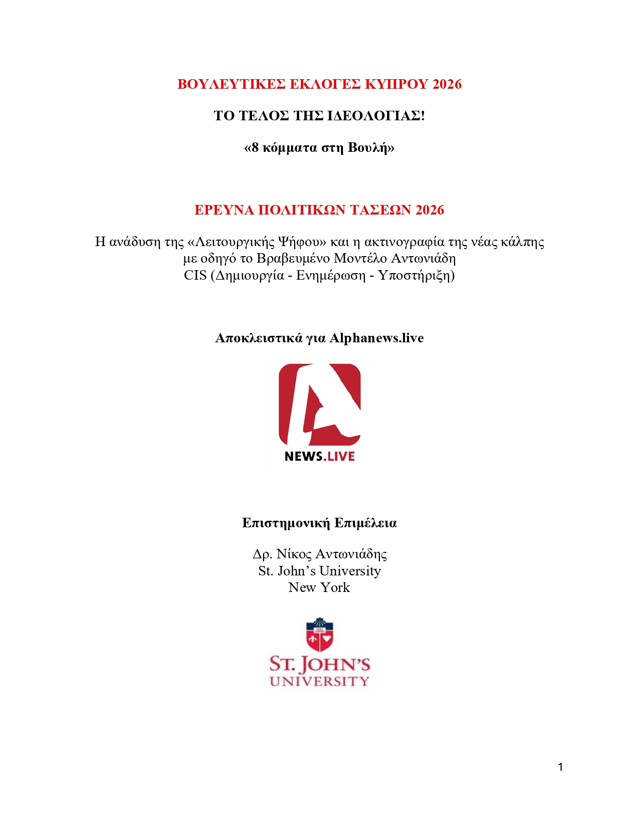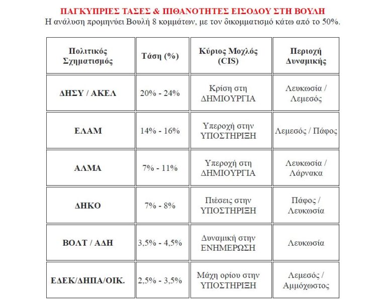 Τον σχηματισμό μιας νέας, οκτακομματικής Βουλής των Αντιπροσώπων καταδεικνύουν τα αποτελέσματα έρευνας που διενεργήθηκε για λογαριασμό του AlphaNews.Live, ενόψει της εκλογικής αναμέτρησης της 24ης Μαϊου 2026, με βάση το βραβευμένο μοντέλο CIS (Δημιουργία – Ενημέρωση – Υποστήριξη) και την επιστημονική επιμέλεια του Δρ. Νίκου Αντωνιάδη.