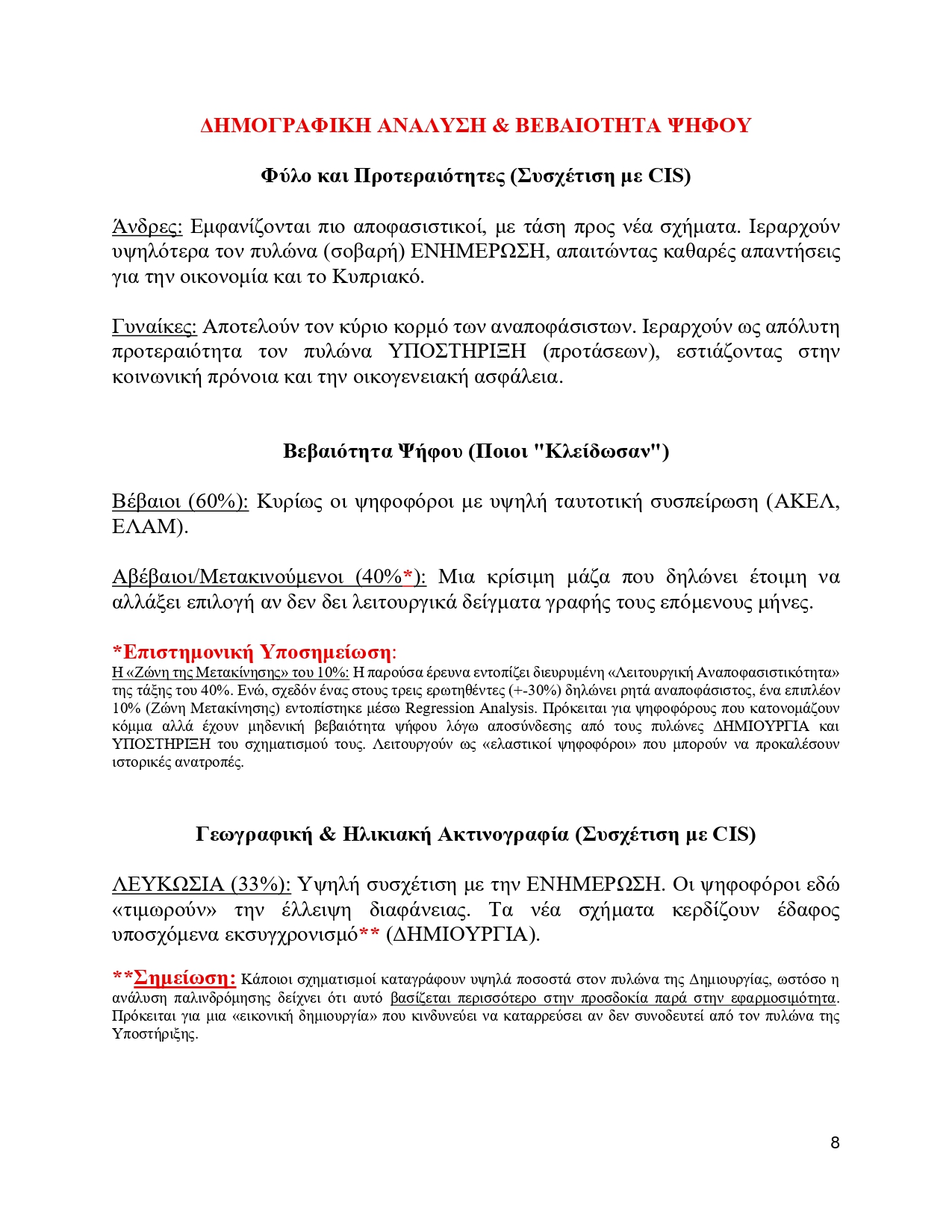 Η ζώνη μετακίνησης: Πέρα από το 30% που δηλώνει αναποφάσιστο, η παρούσα μελέτη εντόπισε ένα επιπλέον 10% που ανήκει στη “Ζώνη Μετακίνησης”. Είναι άνθρωποι που δηλώνουν κόμμα, αλλά η βεβαιότητα τους είναι μηδενική.