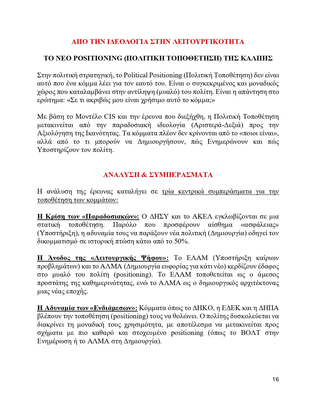 ΓΙΑΤΙ ΑΥΤΟ ΑΦΟΡΑ ΤΟΝ ΠΟΛΙΤΗ: Η ψήφος του κάθε πολίτη δεν είναι πια «λευκή επιταγή» Είναι σαν να αγοράζει ο πολίτης μια υπηρεσία. Αν το κόμμα που ψηφίζει δεν Δημιουργεί λύσεις και δεν τον/την Υποστηρίζει όταν το έχει ανάγκη, τότε η έρευνα μας δείχνει ότι έχει κάθε δικαίωμα (και ήδη το κάνει) να αλλάξει επιλογή. Αυτό είναι η «Λειτουργική Ψήφος».