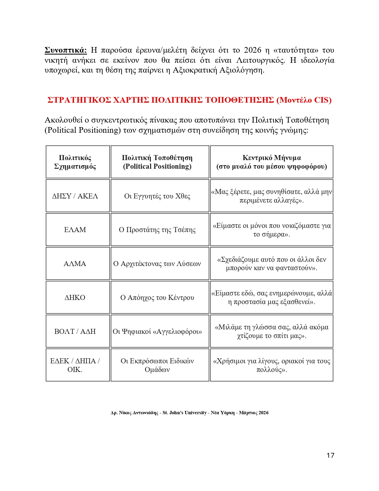 Πρόκειται για ερευνητική μέθοδο που αναλύει τη λειτουργική ψήφο και διδάσκεται στο St. John’s University της Νέας Υόρκης. Ερμηνεύει το 75%* της πρόθεσης ψήφου και βασίζεται στο τρίπτυχο: